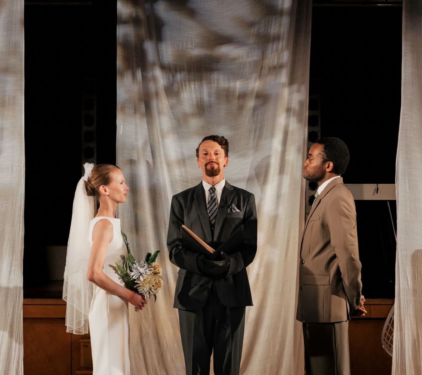 The audience is invited as wedding guests, and all the nuptial trappings are included, along with some fine cello work by Rita Dottor. We quickly understand it is a ruse to cover up a play that is unwelcome in some totalitarian regime that fixates on control of the arts.