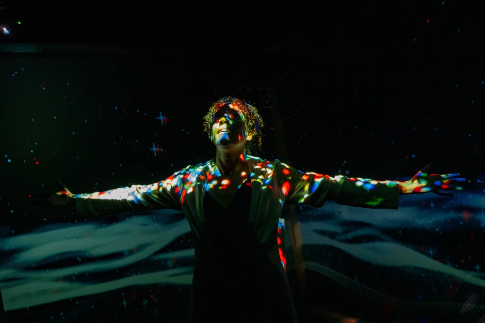 Designer jaymez’s stunning hybrid cinematic and theatrical vision takes my breath away. One must see the colours, lighting designs, and energy in person. Writing about it can’t fully capture the jaw-dropping experience. A tilted frame structure sits centre stage, with the triangular roof pointing towards the audience and the bottom pointing upstage. Two angled scrims frame Hill as she stands centre stage and tells Pandora’s story. The framed structure appears slightly tilted to the right, which only enhances the visual dramatic impact.