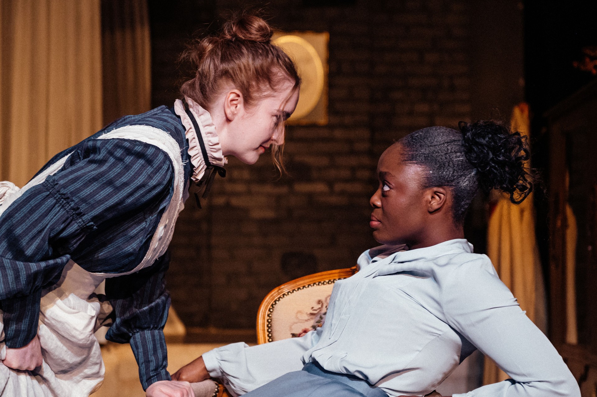 The staging does little to help. The parlour, with its settee and twin chairs, serves as a stand-in for multiple rooms. But it creates more confusion than cohesion, with little to distinguish one space from another, particularly the mansion’s exterior. Franco Pang’s lighting further muddies the picture: parts of the unused set are not dimmed, warm amber tones drain the moors of any sense of cold or menace, and shadowy areas around the perimeter mask actors who should be the focus.