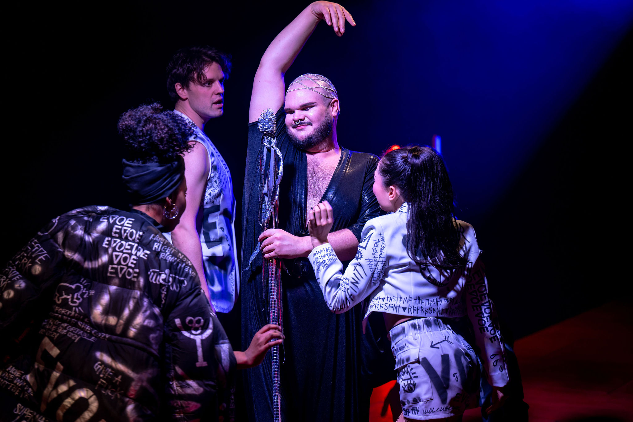Based on ‘The Bacchae’ by Euripides and set in the City State of Thebes somewhere in time, Coal Mine’s world premiere of ‘Dion: A Rock Opera’ explores the myth of the god Dionysius, the son of Zeus and Semele (who died in childbirth). In this re-working adaptation, the self-proclaimed, non-binary Demi-God Dion (Jacob MacInnis) leads the Thebans out of the city to drink wine, get drunk and enjoy the Dionysian pleasures that come with it all.
