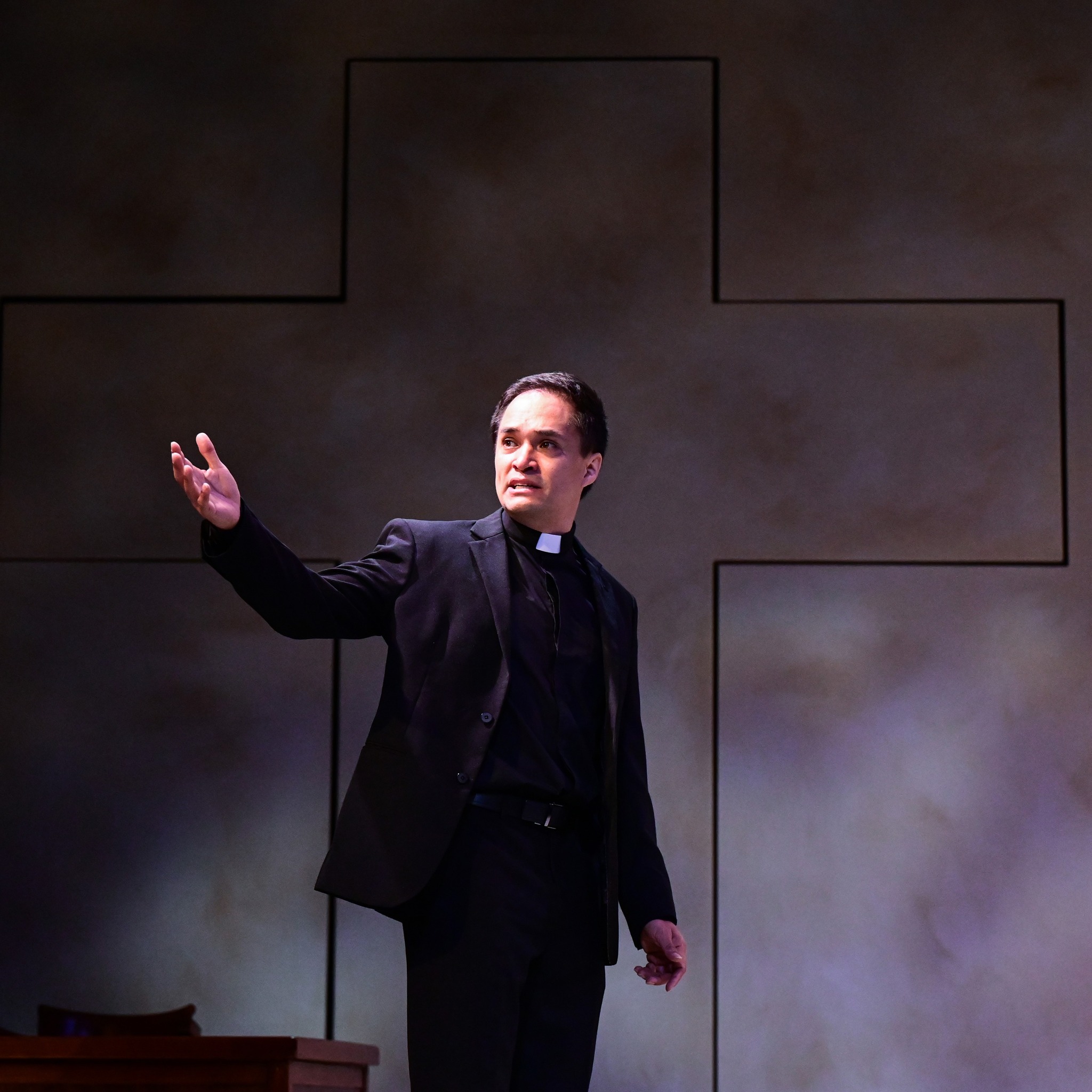 At the top of the show, Flynn and the Sisters enter from the back of the auditorium. Flynn dons the traditional vestments that priests wear to celebrate Mass. He raises his arms to the congregation as if to begin the first homily about doubt.