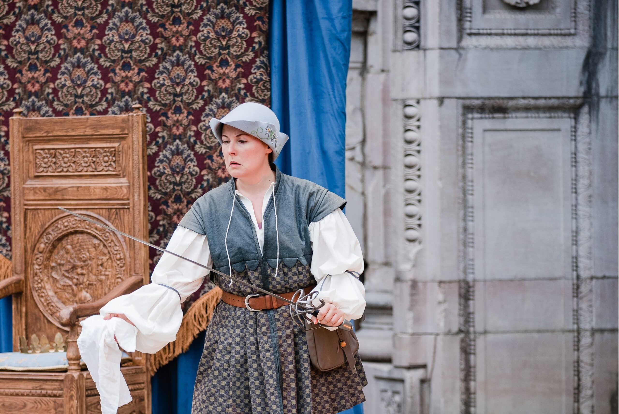 The park setting effectively reflects the suggested grandeur of Adam’s narrative. Production Designer Nancy Anne Perrin ensures accurate reproduction of Elizabethan costumes. An elegant-looking throne sits stage left, while various props and furniture are concealed stage right before the performance begins. Sean Meldrum’s selection of pre-show music successfully evokes the atmosphere of the Elizabethan era for the audience. Adam Walters’ crafted lighting design highlights key areas of the stage and enhances dramatic moments by utilizing the effect of the setting sun during the production.