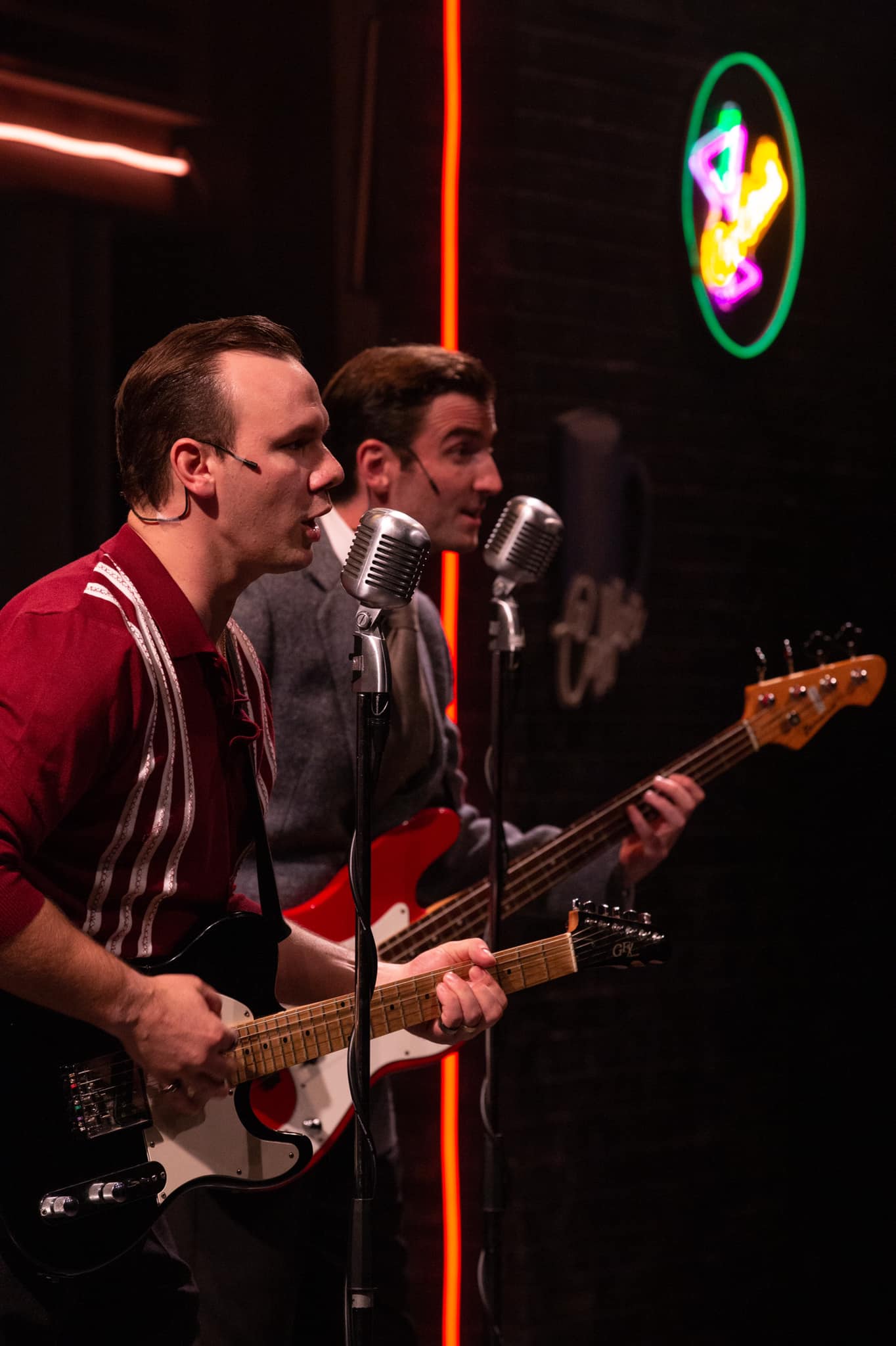 Brian Dudkiewicz’s split-level set design amply fills the Springer stage without ever appearing or feeling cramped. The awesome-sounding band members play just off-centre stages to right and left of the centre stage entrance and exit. Brandon Kleiman’s costume designs are a fitting re-creation of the era. Kudos to Sound Designer Steve Marsh as the sound balance between the band and the actors worked beautifully from where I sat. Jareth Li’s sharply focused lighting design helped to underscore those heightened dramatic moments. A highlight of this occurred in the second act where Tommy DeVito is forced to come clean about his financial woes and what they have done to the group.