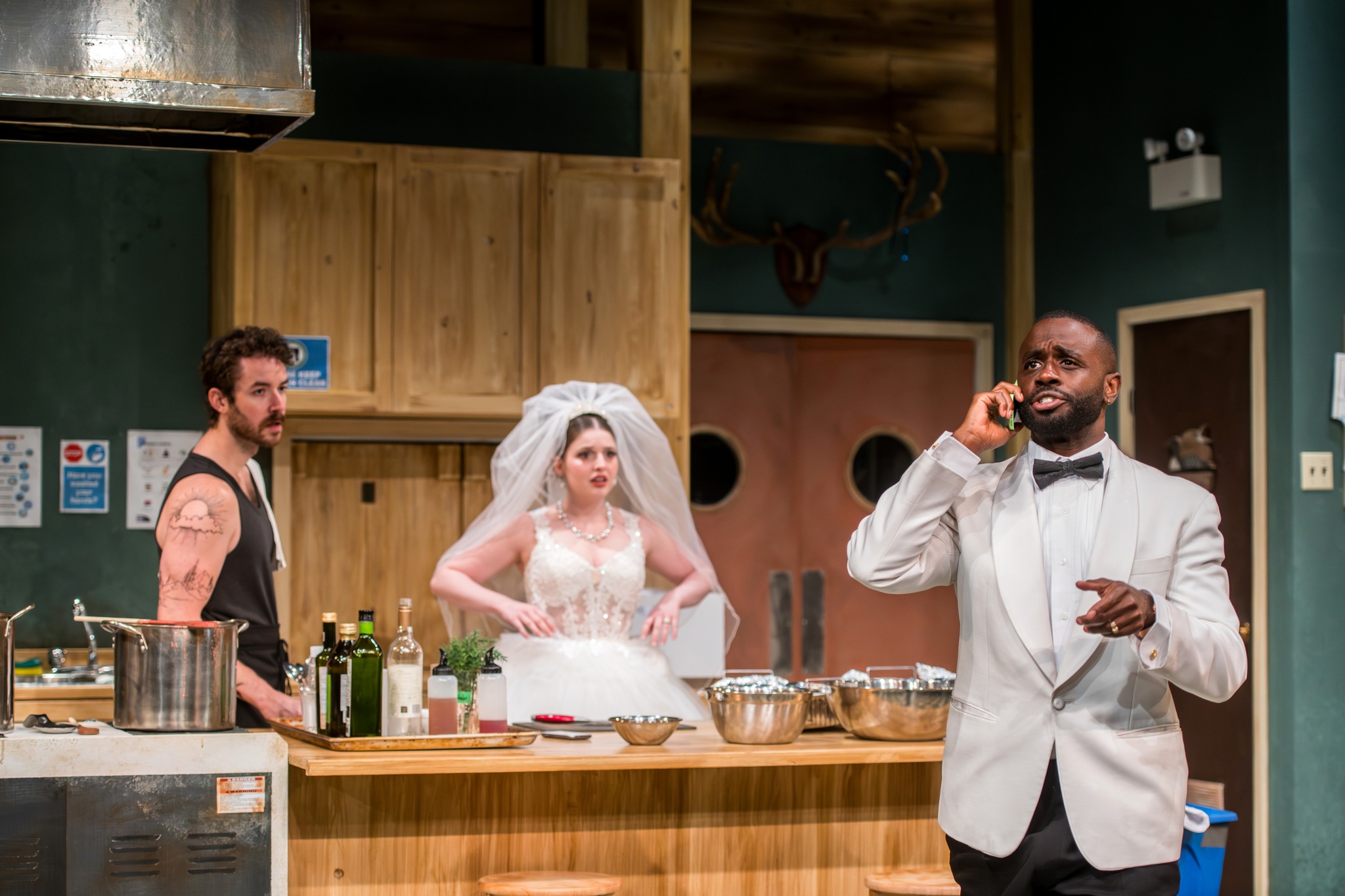 Kyle Brown’s comedic henpecked Rob also underscores much of the humour in the story, particularly in his relationship with Mandy. However, Brown also showcases a more sincere, touching side in the second act during a heart-to-heart conversation with Dee, which unfortunately becomes misunderstood a few moments later. Sayer Roberts is a nice guy, street-smart caterer, Jay, who also gets caught up in the unfolding events of the evening. Roberts’ Jay knows when to hold his own in not allowing anyone to bully or control what he has been paid to do regarding the wedding. Jay’s backstory, which becomes evident as the play unfolds, explains a great deal about his intentions and what remains most important to him.