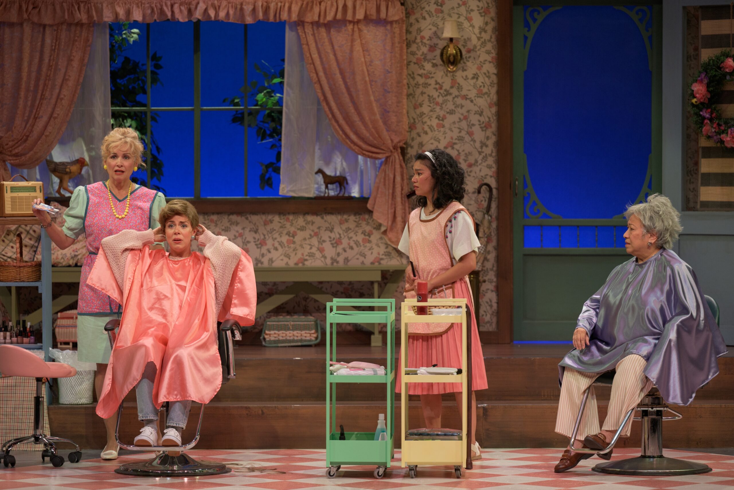 Annelle Dupuy (Belinda Corpuz) applies for a job at Truvy’s salon. Annelle is reluctant to share how she ended up in town. Throughout much of the first scene of Act One, she listens intently to the other ladies who arrive for their weekly hair appointments. Shelby Eatenton (Charlotte Dennis) comes to get her hair done first because it is her wedding day. Her mother, M’Lynn (Deborah Drakeford), arrives trying to be as calm as possible as her unseen husband, Drum, continues firing off his gun. He wants to get the birds out of the magnolia trees before the wedding reception. Clairee Belcher (Carolyn Fe), a well-respected and wealthy widow, loves coming to the salon for her weekly get-together with her friends. Ouiser (Brenda Robins) arrives later than the others, yet she is fit to be tied in her anger and frustration. The unseen Drum’s firing of his gun sets off Ouiser’s unseen nervous dog, Rhett. Ouiser has had enough, and she wants M’Lynn to take action.