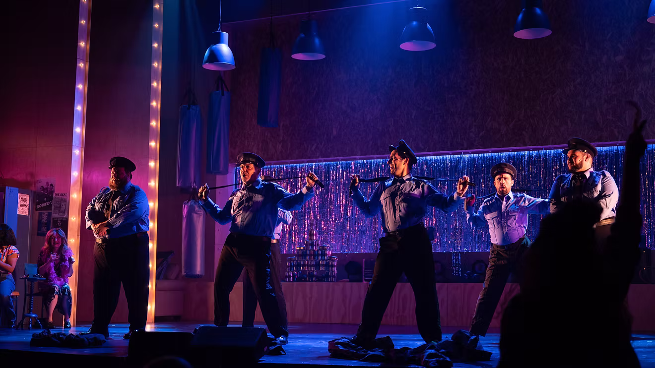 At the top of the show, the audience hears a performance of GIRLS’ NIGHT OUT at a local bar where Chippendale dancers perform. Best friends Jerry (Gaelan Beatty) and Dave (Daniel Williston) spy on the women’s behaviour and are astonished at what they witness. After speaking with Keno (Alex Wierzbicki), one of the scantily clad dancers, Jerry and Dave devise an idea to make some quick cash. They find four other guys, each with their own unique personalities and struggles: Ethan (Darren Burkett), Horse (Gavin Hope), Malcolm (Jacob Macinnis) and Harold (Ian Simpson), to develop a one-night-only show where they will perform a strip show.