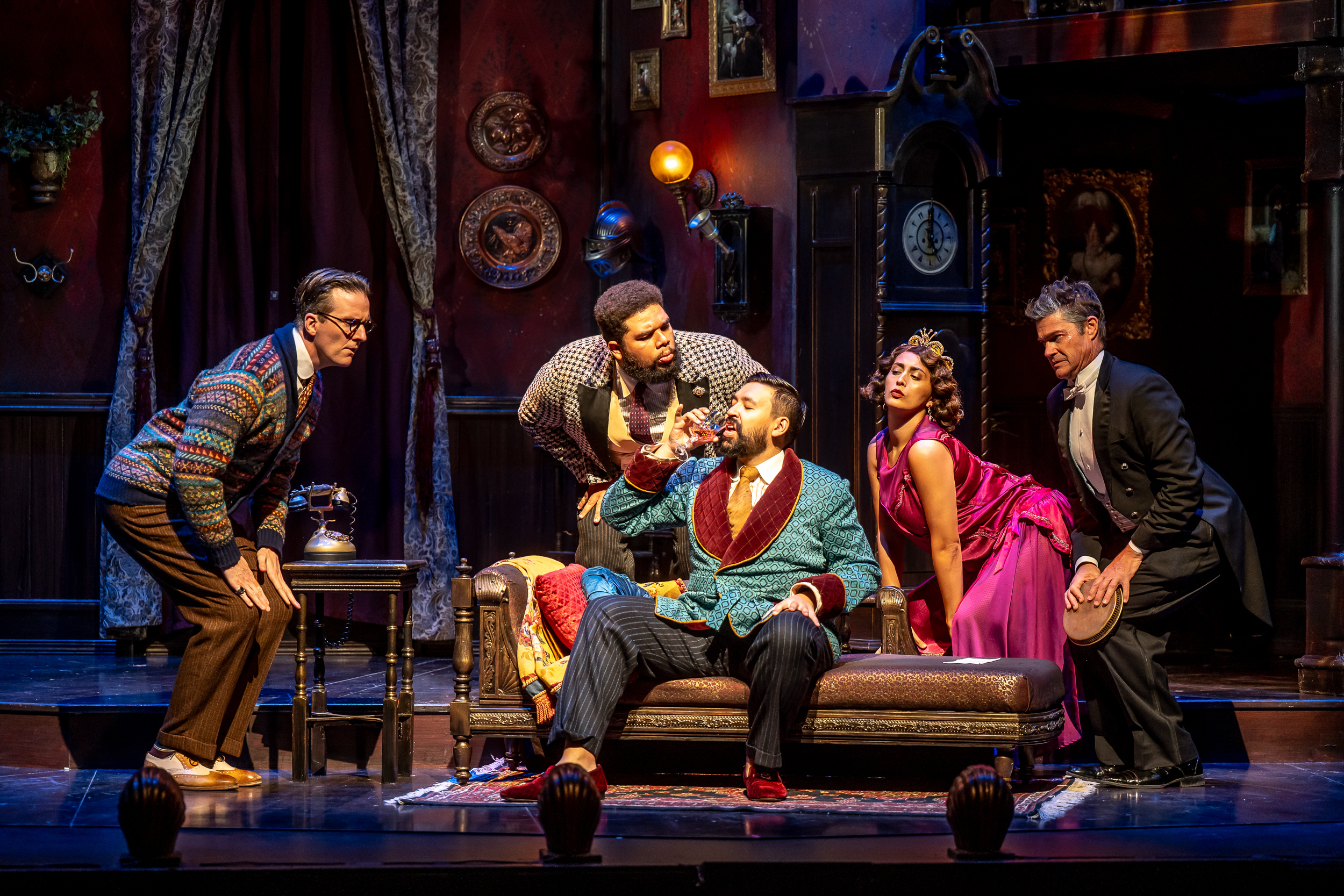Beyata Hackborn’s 1920s two-storey manor set is spectacular. Probably the best word is stunning. Close attention to detail has been observed, right down to a decorative skull on one of the bookshelves and dust on some leather-bound books. Joseph Abetia’s costumes are impressive recreations of 1920s fashion, from the bright dresses worn by the women to the men’s tuxedos. Kimberly Purtell’s lighting design highlights specific moments to help create comic tension. Dave Pierce and Donoavan Siedle receive separate credits as composers and sound designers. That’s a smart choice because it seems a great deal of preparatory work has been done, from specific pre-show music and songs as the audience enters, right down to sound effects that must work perfectly on the first try.
