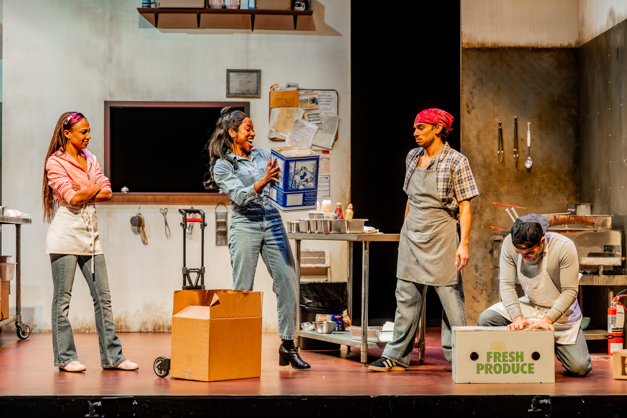 Set in the greasy-spoon back kitchen of a truck stop, Sophia Walker plays Clyde, the sultry, sexy, and downright nasty, callous owner who has hired four inmates: Rafael (Augusto Bitter), Letitia (Jasmine Case), Montrellous (Sterling Jarvis), and Jason (Johnathan Sousa), the only white person in the kitchen. There is the order window through which Clyde places the dinner tabs, but the audience does not see any hint of the dining room. It’s dark beyond the window.