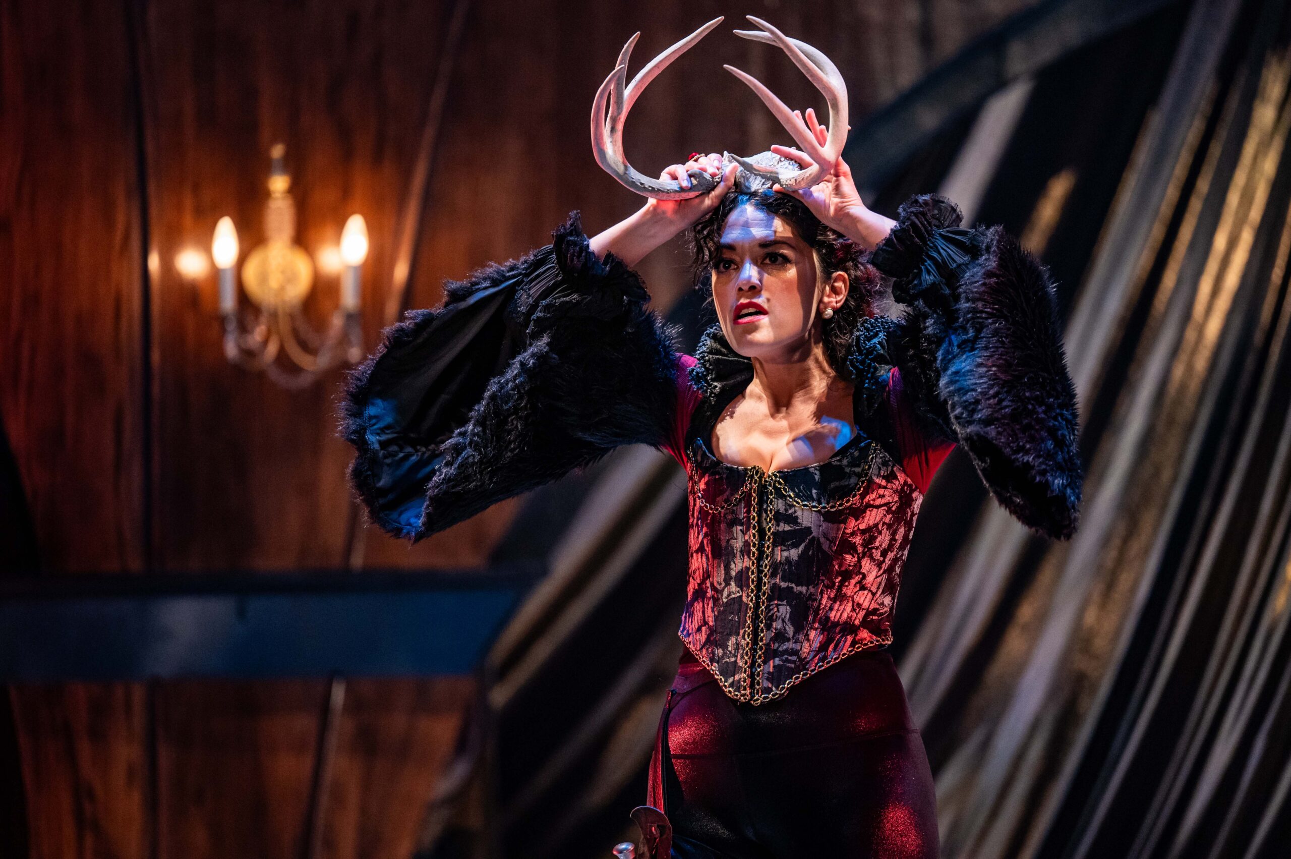 Set design by Nick Blais is a dramatic punch to the senses. Massive antlers envelop the stage as they rise, almost two stories seething masculinity. The hunting motif is turned upside down as Catherine becomes the more accomplished hunter while she overtakes her evil husband. The court is austere and stylish, with dark wood and deep golden curtains—a bust of the severe former king peers down at the proceedings.